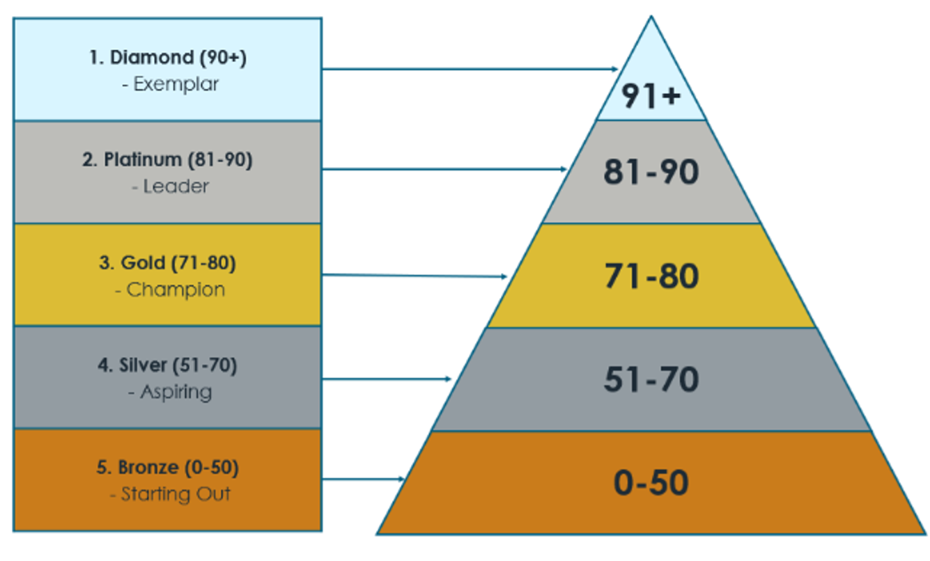Your results are compared against organisations in your sector and against best practice standards. The scoring system rates organisations as Starting Out (below 50), Aspiring/Silver (51-70), or Champion (71-80) or Platinum 81-90 and Diamond 91+. You can see exactly where you stand relative to peers and what it would take to reach the next level.